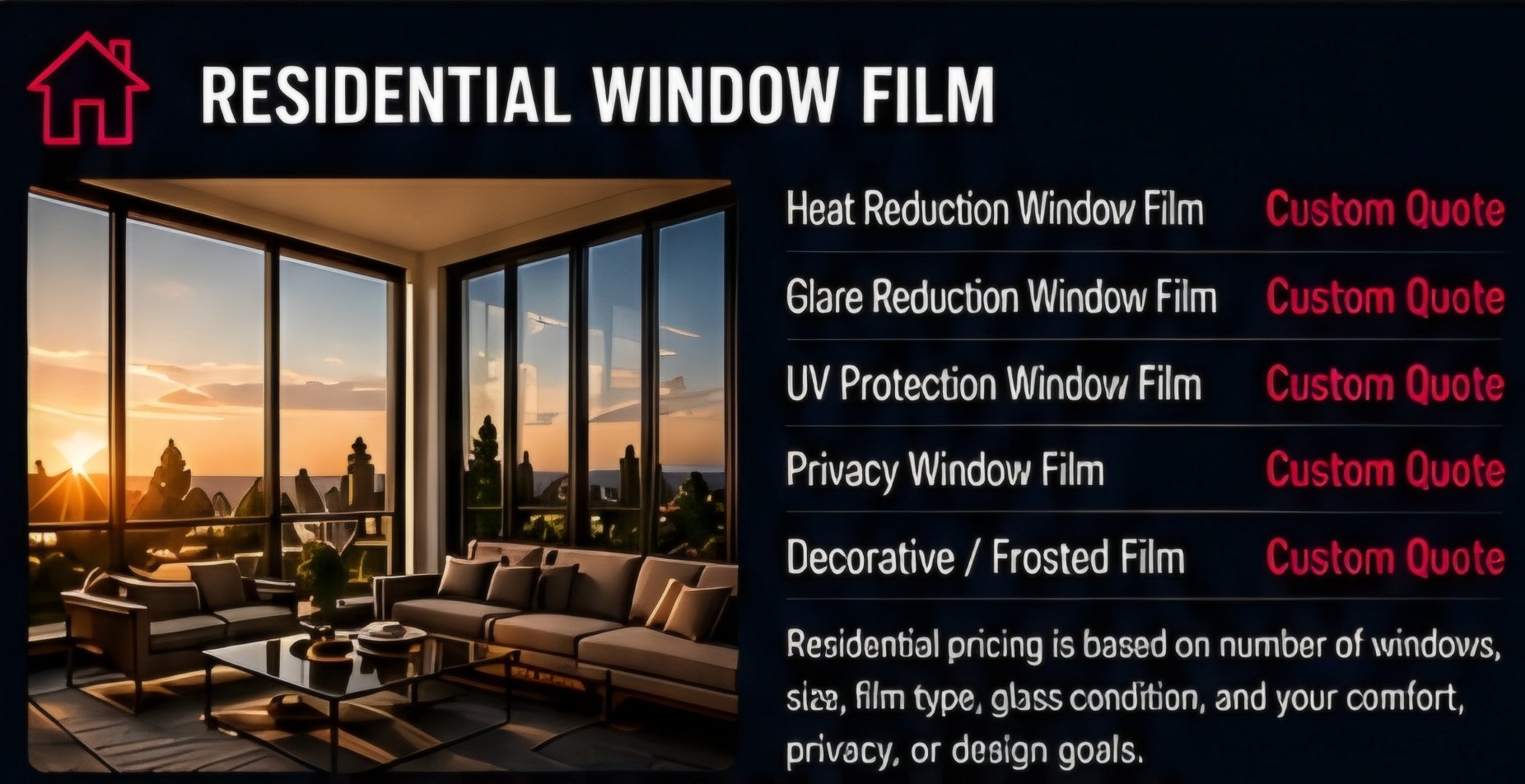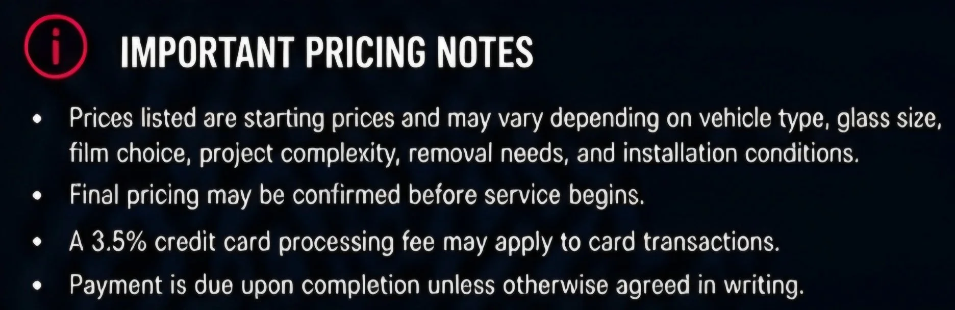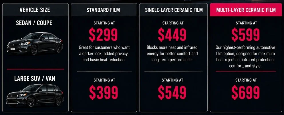 At Elite Pros Window Tinting, we believe choosing the right film should be simple. Explore our Pricing below and schedule with confidence